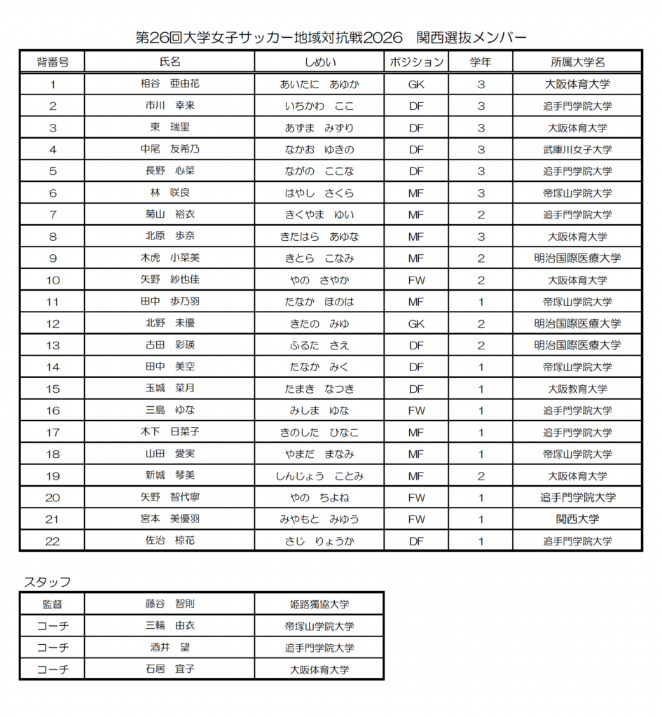 2026年2月24日(火)〜27日(金)に、静岡県/時之栖で開催されます第26回大学女子サッカー地域対抗戦2026に参加する関西選抜のメンバーをお知らせいたします。